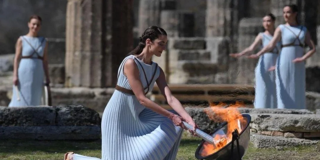 La llama olímpica se encendió en las ruinas de Olimpia, en la tradicional ceremonia que entrega la antorcha al primer portador, que inicia el recorrido por tierras griegas hasta su entrega al país anfitrión, Japón.
