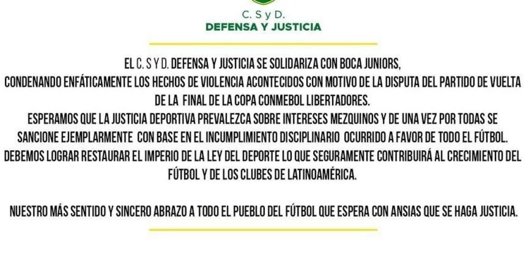 "Defensa y Justicia se solidariza con Boca Juniors, condenando enfáticamente los hechos de violencia acontecidos con motivo de la disputa de partido de la final de la Copa Conmebol Libertadores.