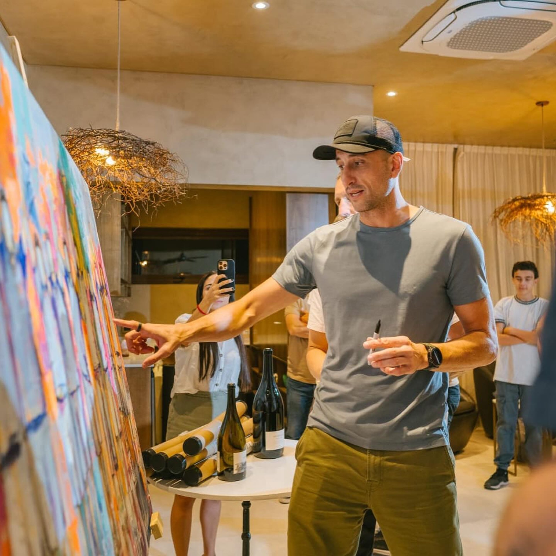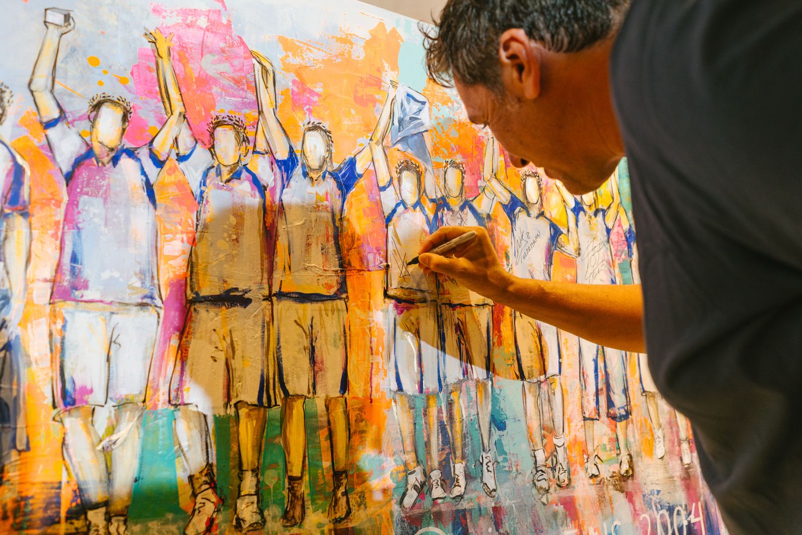 Al momento de descubrir el cuadro, la emoción afloró en los rostros de los basquetbolistas, que sin esperar, se acercaron al lienzo para buscarse en la pintura. Entre chistes, los doce se acercaron al cuadro y dejaron impresa su firma arriba de sus camisetas. El agradecimiento hacia el presente no se hizo esperar, donde los amigos remarcaron que si bien han recibido muchos regalos en su carrera, este fue el homenaje artístico más lindo que han tenido, sobre todo al tratarse de un regalo que abarca a todo el grupo. Vale aclarar que cada jugador se llevó una réplica del cuadro, pero aún no decidieron quién se quedará con el original.