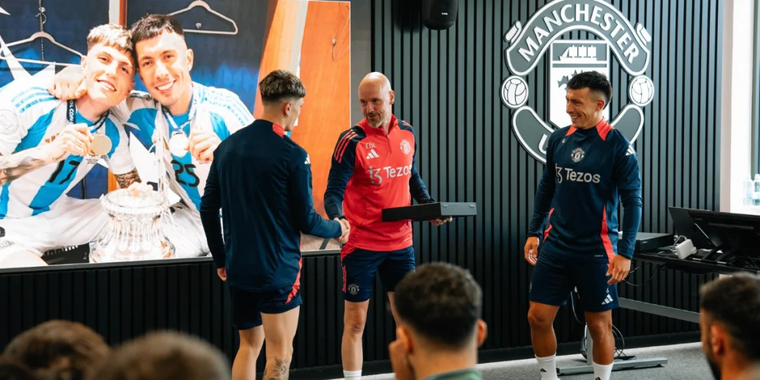 La ceremonia tuvo lugar en Carrington con la presencia de Erik Ten Hag y el resto del plantel. Ambos recibieron una placa conmemorativa, en un acto cargado de orgullo por su logro en el torneo continental. Martínez y Garnacho fueron aplaudidos por sus compañeros.