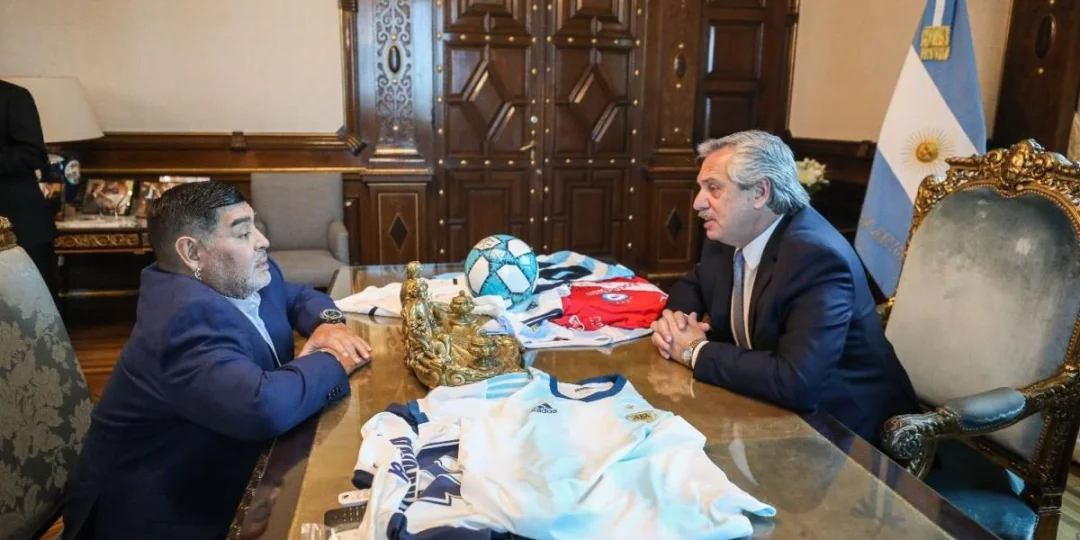 En el despacho presidencial, el Diez desplegó sobre el escritorio de Fernández una decena de camisetas de Argentinos Juniors -el presidente es hincha del "Bicho"-, la Selección argentina y Gimnasia de La Plata, su actual club. Además, le regaló una pelota.