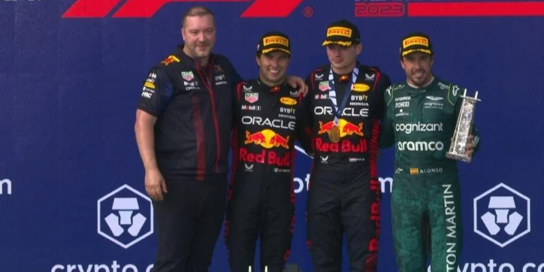 El neederlandés partió desde la novena posición y escaló hasta ubicarse al frente del pelotón tras dar cuenta en última instancia de su compañero Sergio Checho Pérez, autor de la pole position el sábado y aspirante a la punta del Mundial de Pilotos.El mexicano, que llegaba de ganar en el callejero de Bakú, Azerbaiyán, finalizó en el segundo lugar de la carrera, por delante de Fernando Alonso (Aston Martin), quien firmó su cuarto podio en la campaña.