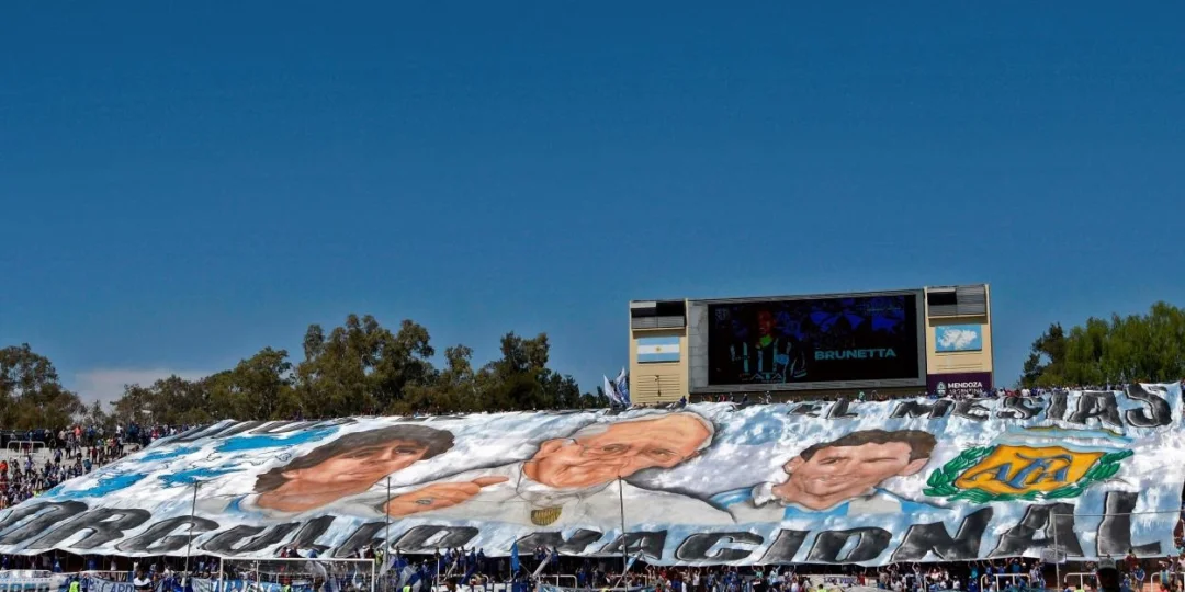 En 2014, en la popular del estadio Malvinas Argentinas, los hinchas de Godoy Cruz sorprendieron con una enorme bandera que se convirtió en ícono. Con las imágenes delpapa Francisco, Diego Maradona y Lionel Messi, el trapo fue desplegado por primera vez en un partido contra Racing, pero rápidamente trascendió el ámbito local.