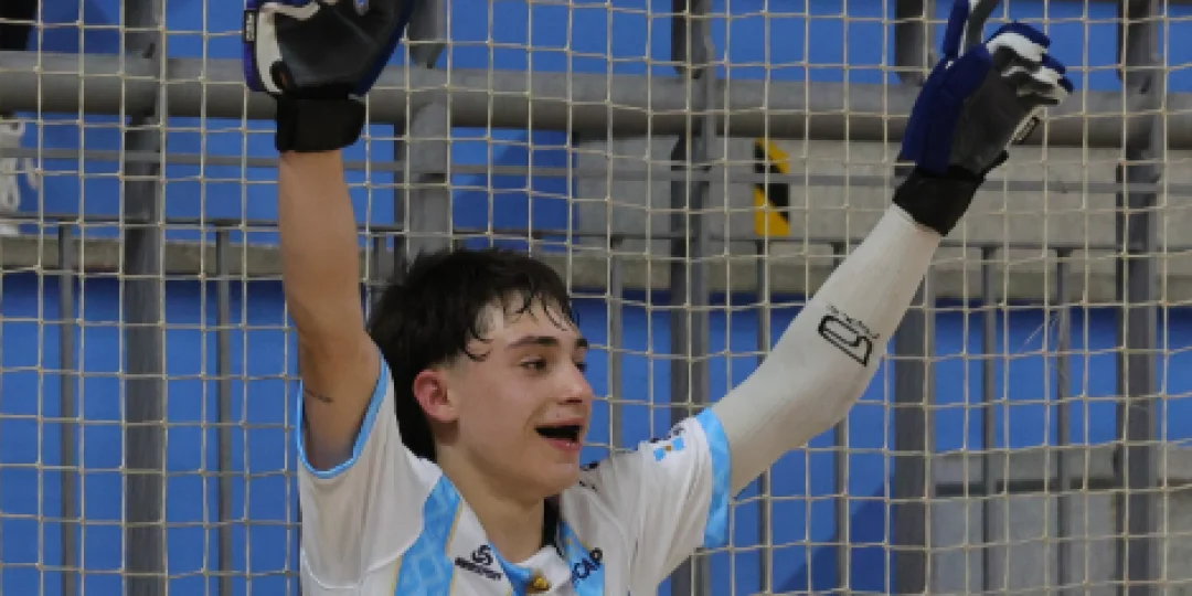 Valentino "El Pintita" Marzonetto, festejando uno de los goles convertidos durante el reciente Mundial de Hockey sobre Patines, en Novara, Italia. Facebook