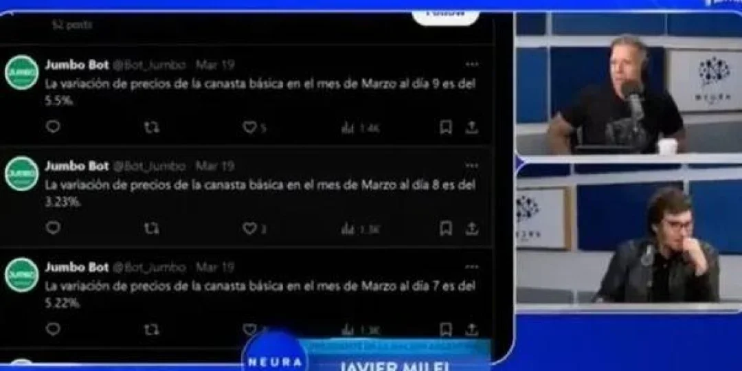 Fantino le preguntó al presidente sobre cómo sabe que la inflación baja, a lo que Milei dijo que mira las publicaciones en X (Twitter) de la cuenta @bot_jumbo para argumentar que hubo “caída de precios”. “Pasamos de 5,22% a -4,52%. Se va a derrumbar la tasa de inflación”, afirmó ante el conductor.