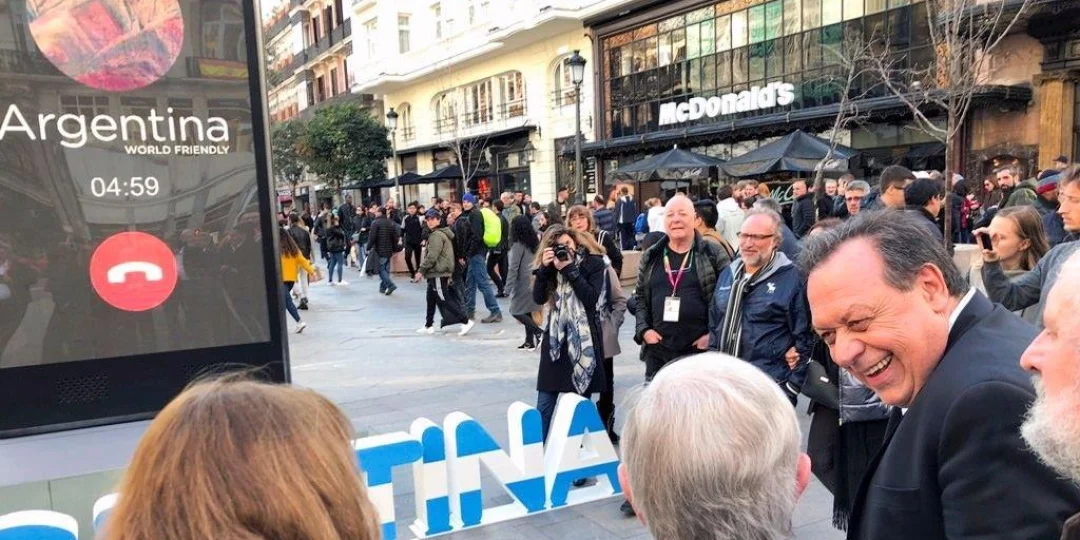El Ministerio de Turismo de la Nación está desarrollando un novedoso sistema de marketing para promocionar en España las bellezas de la Argentina. Para eso instaló un teléfono celular gigante en pleno centro de Madrid para hacer conocer los destinos turísticos del país a través de videollamadas entre un turista español de vacaciones en nuestro país y los transeúntes de la Gran Vía, la arteria más conocida de aquella ciudad.