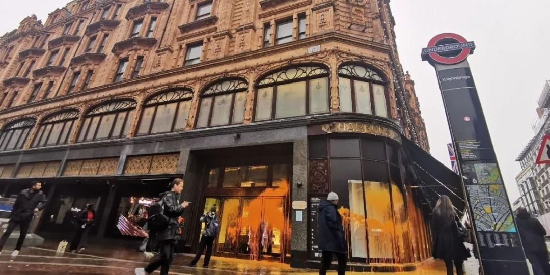 Hoy lanzaron pintura naranja contra un local de la tienda Harrods y luego se sentaron en la calle para bloquear el tráfico. Personal de seguridad de Harrods retuvo a los manifestantes mientras se esperaba la llegada de las fuerzas de seguridad. Finalmente, la Policía intervino en la situación y detuvo a dos personas.