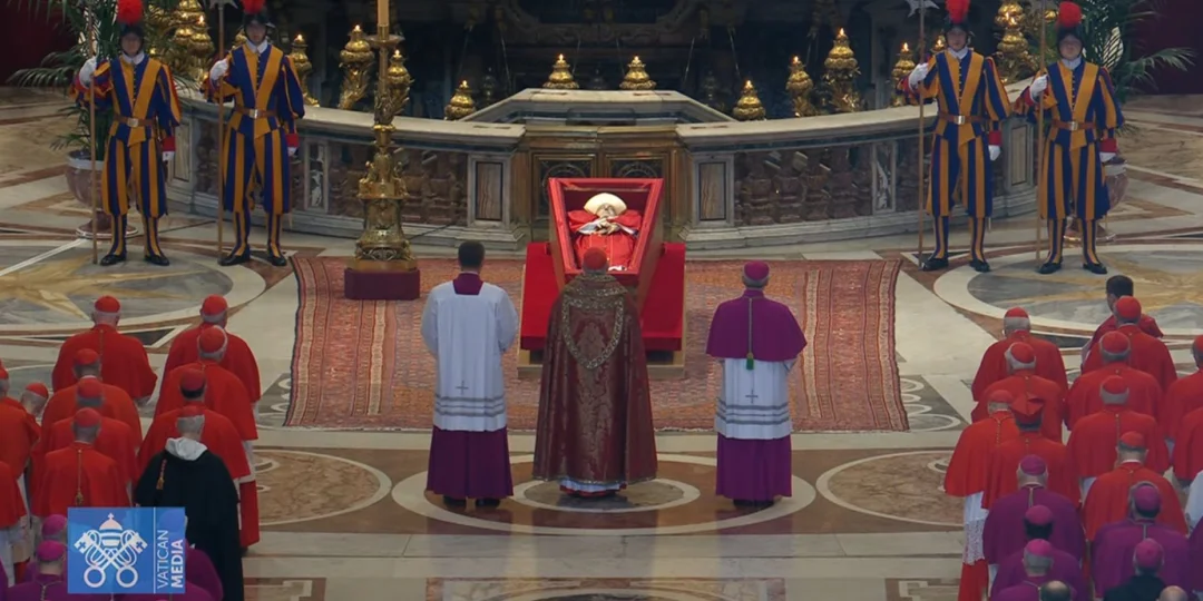 El ataúd del Sumo Pontífice fue colocado en el altar de la confesión, un espacio sagrado frente al altar mayor, sobre la tumba de San Pedro, el primer pontífice. Los cardenales presentes en la basílica se acercaron al féretro en parejas para presentar sus respetos.
