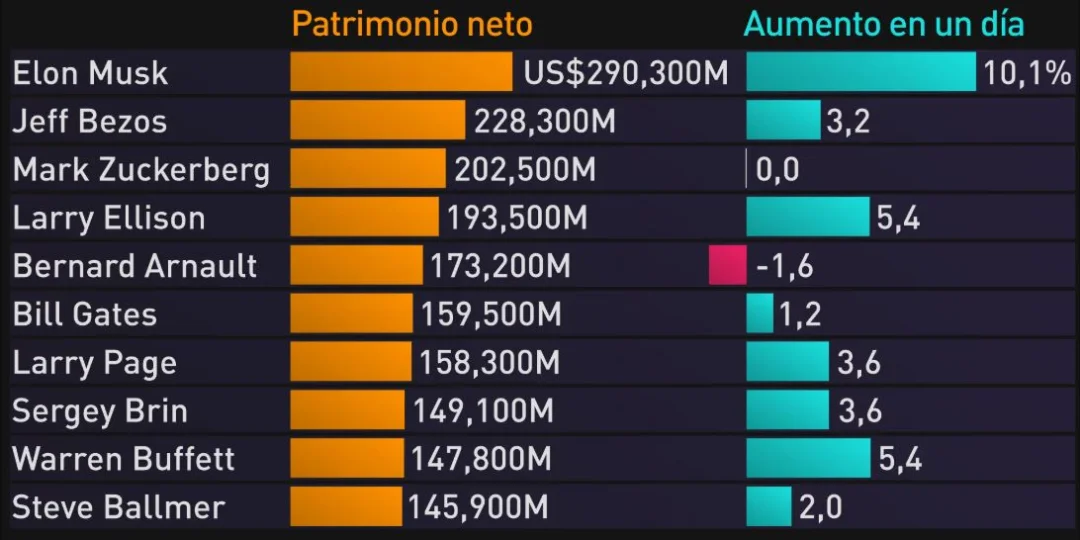 En contrapartida, Estados Unidos, muestra una tendencia sostenida de crecimiento de la riqueza de los multimillonarios, aunque más concentrada. La escalada fue de un poco más del 50%, entre 2015 y 2020, y se disparó al 58,5% entre 2020 y 2024, alcanzando los 6,1 billones de dólares (un 40% del PBI total de EE.UU.).