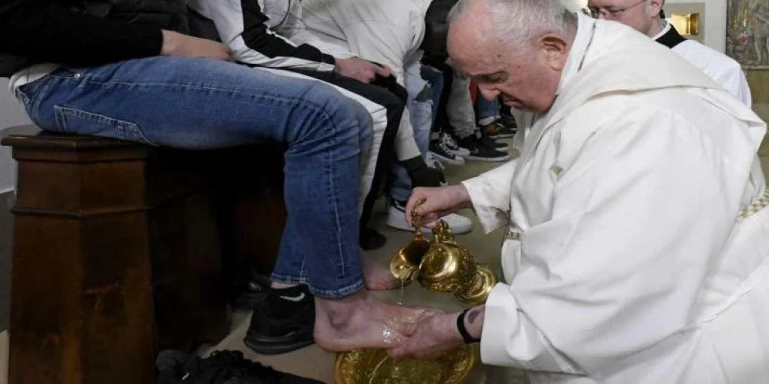 En este año eligió estar con los reclusos de la prisión de menores de Casal del Marmo, la misma que eligió diez años atrás. Debido a sus molestias en la rodilla, no se postró ante ellos. En su lugar, los jóvenes se sentaron en un banco sobre un estrado para que el Papa pudiera lavarles sus pies parados.