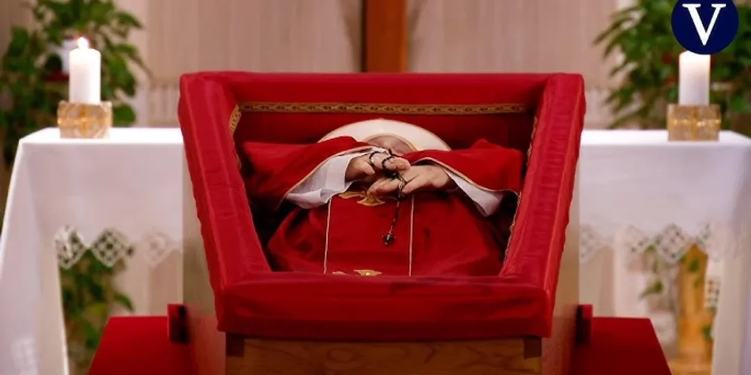 El Vaticano hizo públicas este martes las primeras imágenes del féretro del papa Francisco. El ataúd del Sumo Pontífice está dispuesto en la Capilla de Santa Marta. Se trata de un simple ataúd de madera abierto sin el catafalco, en el que el Papa descansa vestido con la mitra, la sotana blanca, la casulla roja y el palio blanco. En sus manos sostiene el rosario.