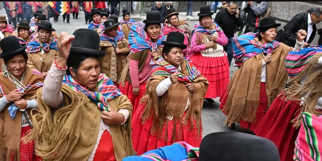 Ataviados con vestimenta tradicional de ponchos rojos, sombreros negros y atuendo celeste, miles de indígenas aimaras rodearon la plaza colindante al Palacio Quemado, una de las sedes de la presidencia, aunque el acceso a la misma fue bloqueado por la policía antimotines.