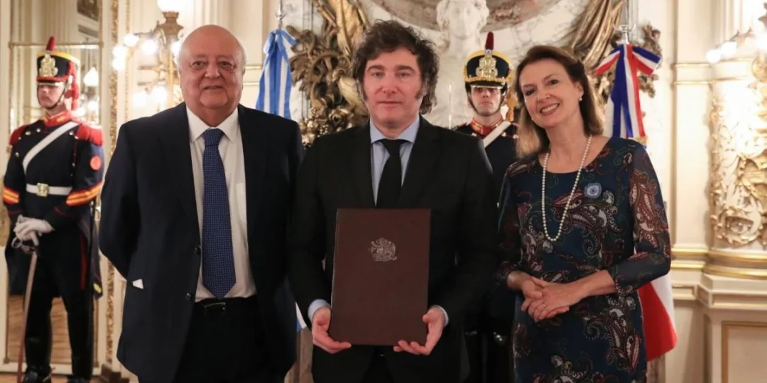 "El embajador de Chile, José Antonio Viera-Gallo, presentó sus cartas credenciales ante el Presidente @JMilei, junto a la Canciller @DianaMondino en la Casa Rosada, reafirmando la voluntad de fortalecer la colaboración entre ambas naciones", informó la cuenta oficial en la Red Social X de la sede diplomática trasandina en Buenos Aires.
