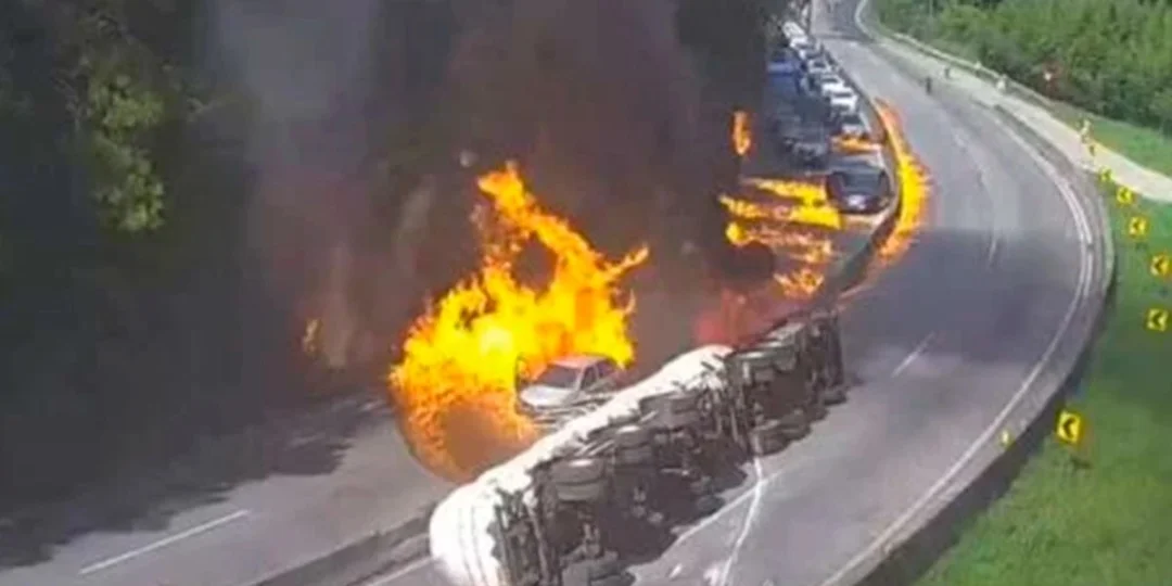El episodio ocurrió exactamente a las 13.37, hora local. El vehículo de gran porte, con cabina roja y tanque blanco, perdió el control en una curva hacia la izquierda, volcó sobre su flanco y derramó etanol en grandes cantidades. En segundos, el líquido inflamable se encendió y una gigantesca llamarada cruzó la autopista en dirección contraria, alcanzando de lleno a los autos que circulaban por allí.