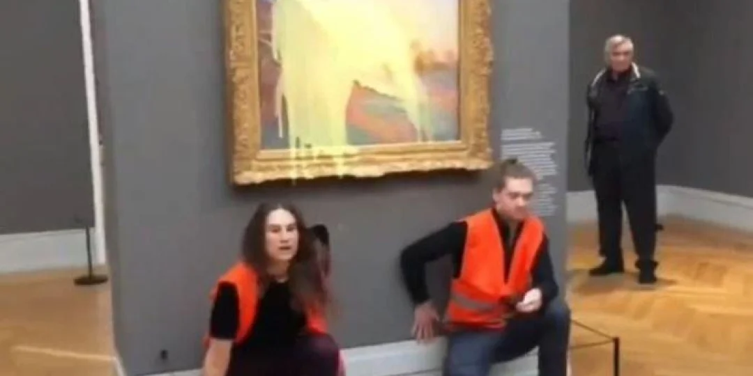 Dos activistas del grupo Last Generation, que le pidió al gobierno alemán tomar medidas drásticas para proteger el clima y que se dejen de usar los combustibles fósiles, se acercaron a Les Meules de Monet, en el Museo Barberini de Potsdam, y arrojaron una sustancia espesa sobre la pintura y su marco dorado.