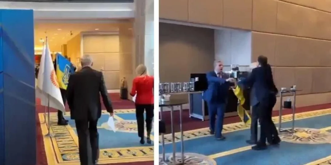 El representante de Ucrania posaba para las fotos, tras finalizar una serie de discursos, con una bandera de las Fuerzas Armadas de su país en la Asamblea de la Comunidad Económica del mar Negro, celebrada en Ankara (Turquía), cuando fue sorprendido por un ruso que se mostraba muy molesto por la situación.