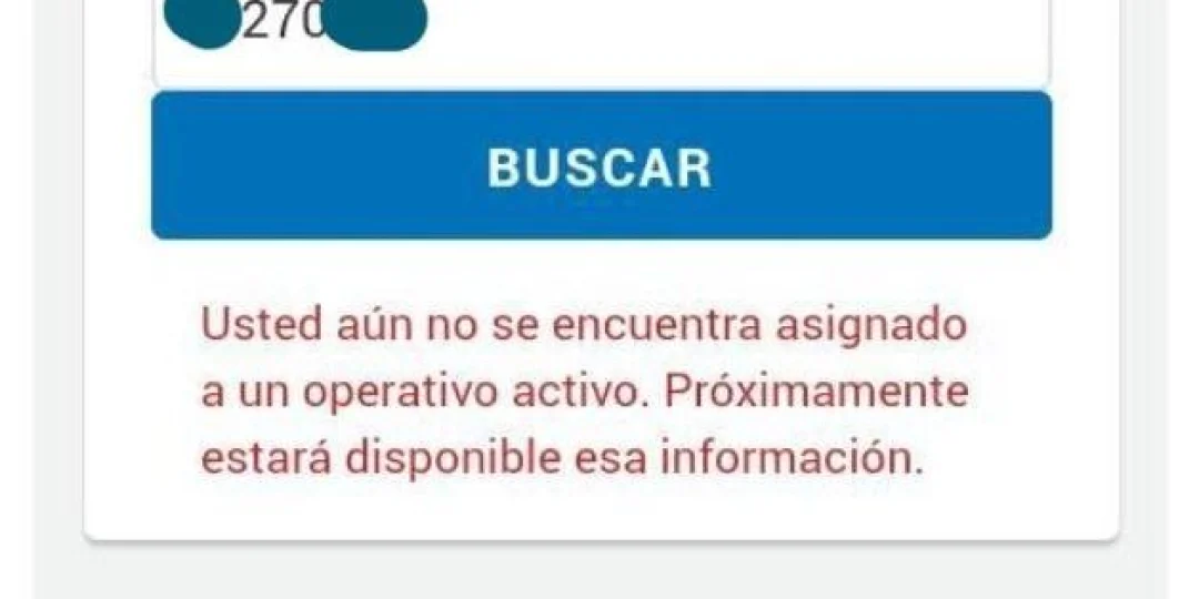 El cartel de letras roja dice: "Usted no se encuentra asignado a un operativo activo. Próximamente estará disponible esa información." (ver foto)