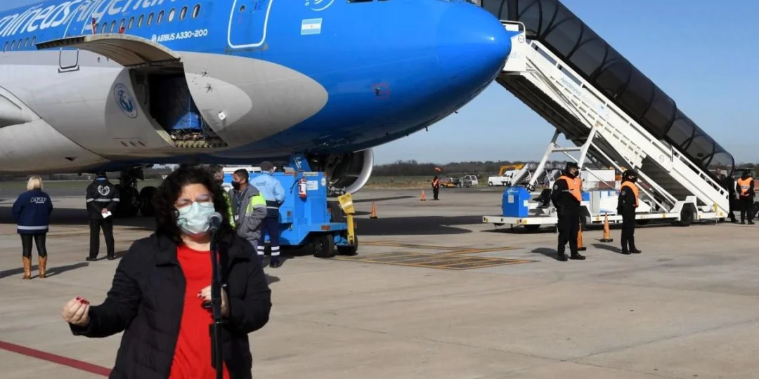 Desde Ezeiza aseguró: "Estamos llegando con 1,4 millones de dosis desde Moscú: con 400.000 correspondientes al componente 1 y 250.000 al componente 2 y 500 litros de la sustancia activa que van directo para su fabricación al laboratorio local de Richmond".