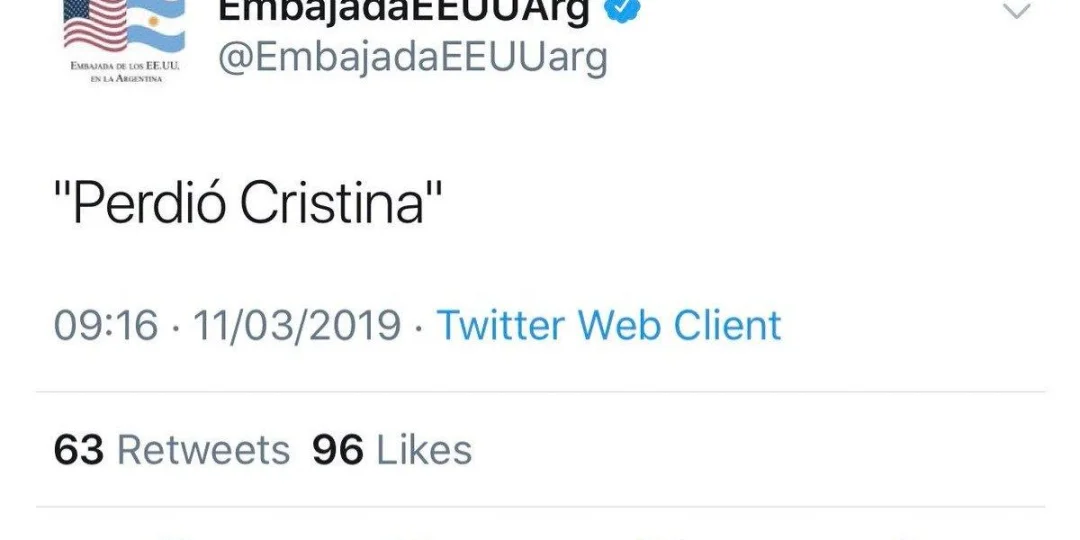 Un extraño mensaje fue publicado en la cuenta de Twitter de la Embajada de los Estados Unidos en la Argentina: "Perdió Cristina". Ocurrió en la noche del domingo, luego de que se conocieran los resultados de la elección en la provincia de Neuquén, donde triunfó el MPN.