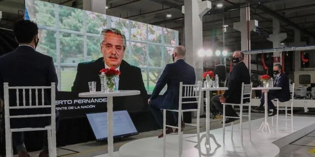 El presidente participó de una videoconferencia a través de la residencia de Olivos, para encabezar el lanzamiento de una nueva línea de fabricación de lavarropas de la empresa Newsan, en su planta situada en el partido bonaerense de Avellaneda.