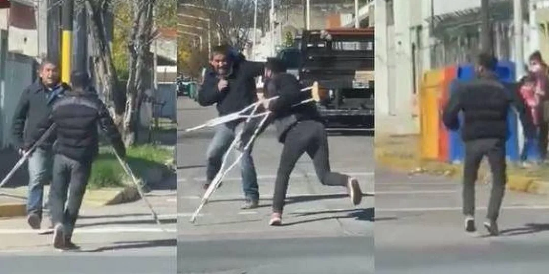 Lo que sí se volvió viral fue la reacción del hombre que llevaba muletas. Primero las usó para defenderse y luego, al ser agredido, salió corriendo.