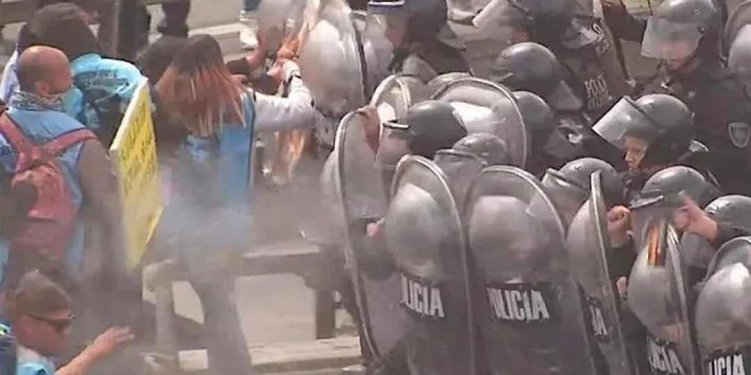 En tanto, la Policía utilizó escudos y aerosoles de gas lacrimógeno en el momento en que los piqueteros intentaban agredir a los efectivos que se encontraban en la primera línea del operativo.