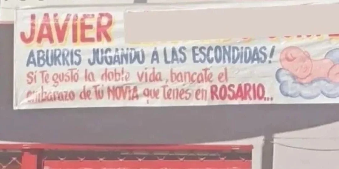 “Javier XXX: Aburrís jugando a las escondidas”, se lee en el pasacalles que fue colgado en la avenida Castro Barros con el nombre y el apellido del susodicho.Y continúa: “Si te gustó la doble vida, bancate el embarazo de tu novia que tenés en Rosario”. Además, el creador de la idea le sumó el dibujo de un tierno bebé.