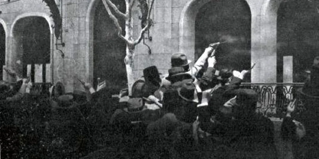 En ese instante se escuchó grito de “¡Viva Yrigoyen!” y partió el primer disparo desde un grupo de personas ubicado entre la puerta central del edificio del Círculo y el balcón cercano al teatro Municipal, sobre la calle España.
