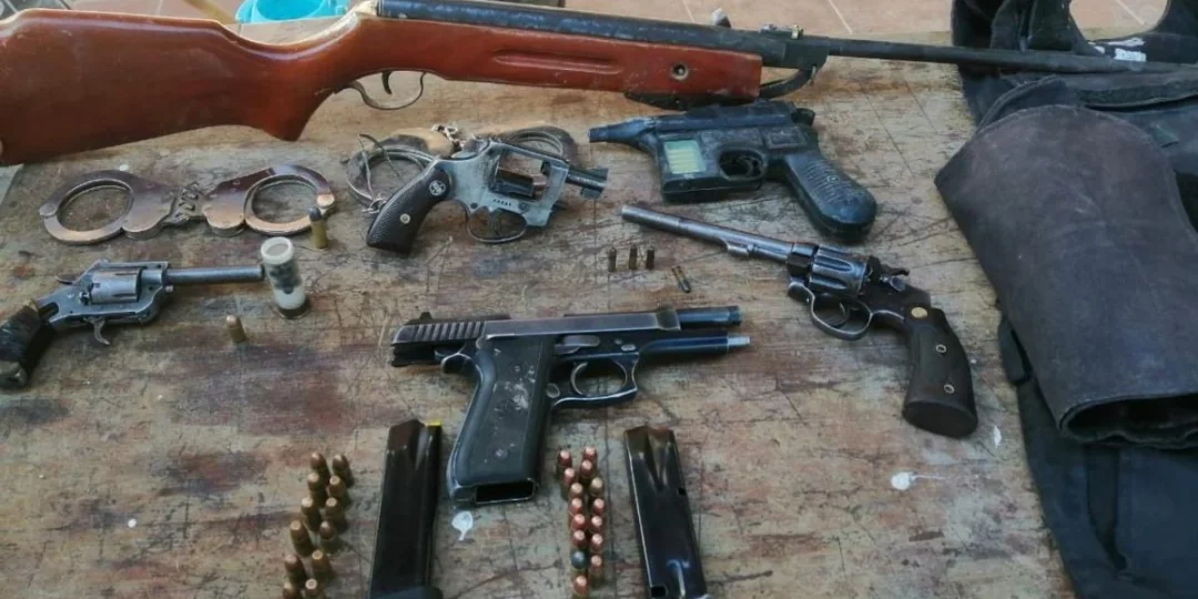 A su vez, se realizó un allanamiento en una casa con cierre perimetral de telas, palos y madera se procede al secuestro de: una pistola calibre 9mm marca Forjas Taurus con numero fabril suprimido (tenia colocado un cargador con 15 municiones de 9mm) un cargador con 14 municiones 9mm, un revolver calibre 32 largo marca rubi, un revolver marca tala calibre 22 largo una bala calibre 38 special cbc y una bala calibre 380 cbc, un revolver marca “el Casco” calibre 22 largo con cuatro municiones colocadas en el tambor, una mochila color negra y un casco color blanco dos pantalones cargo policiales, un cinturón de perlon, una pistolera muslera, una remera azul policial con una bandera y sin escudos, una tricota policial azul, con bandera argentina y sin escudos, un par de borcegos tácticos, marca febo un chaleco antibalas negro con la inscripción RBR internacional, una placa balística bajo inguinal sin inscripciones, una placa balística de tórax sin inscripciones, un juego de esposas marca Alcatraz un juego de esposas marca Alcyon dos llaves de esposas, un rifle de aire comprimido sin inscripciones visibles calibre 5.5 una replica plástica de color negro