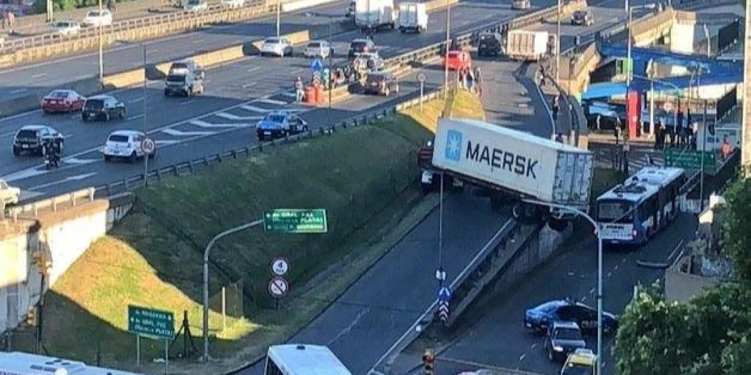 Un camión quedó colgando en plena avenida General Paz, a la altura del barrio porteño de Liniers. Según informaron, el motivo que originó el incidente fue el rodado se quedó sin frenos.
