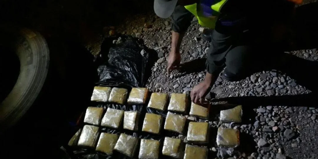 Una vez realizado el narcotest, arrojó un resultado positivo para marihuana por un peso total de 8 kg. Gendarmería detectó además, a 5 metros de allí, las huellas típicas de un camión.