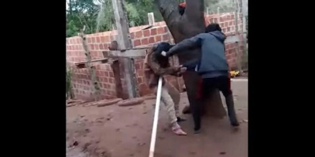 El sujeto, como se puede ver en las imágenes, está fuera de sí y armado con un machete. La mujer agredida intenta defenderse con una tacuara, pero poco puede hacer para detener de su agresor que le gana en fuerza.