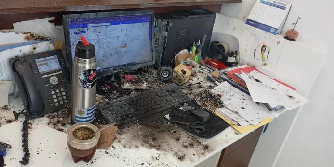 En las imágenes se pueden observar restos de pólvora esparcidos por el lugar, afectando seriamente las computadoras, teléfonos y artículos de uso cotidiano como lapiceras, archivadores y demás objetos de escritorio. El impacto fue tan fuerte que muchos de estos elementos quedaron inutilizables, y la oficina quedó prácticamente devastada.