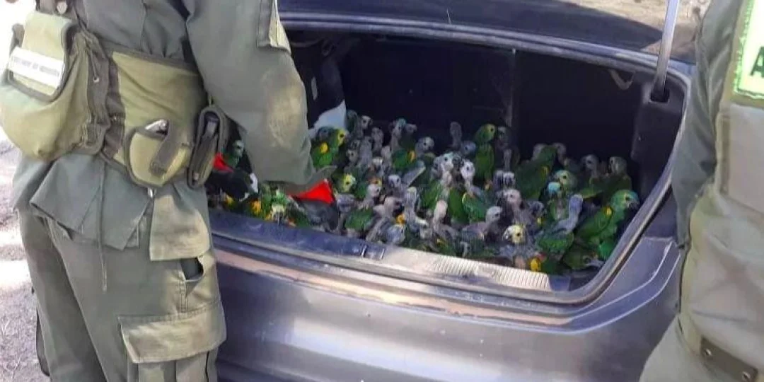Llevaban 100 loros ocultos en el baúl y les secuestraron el auto