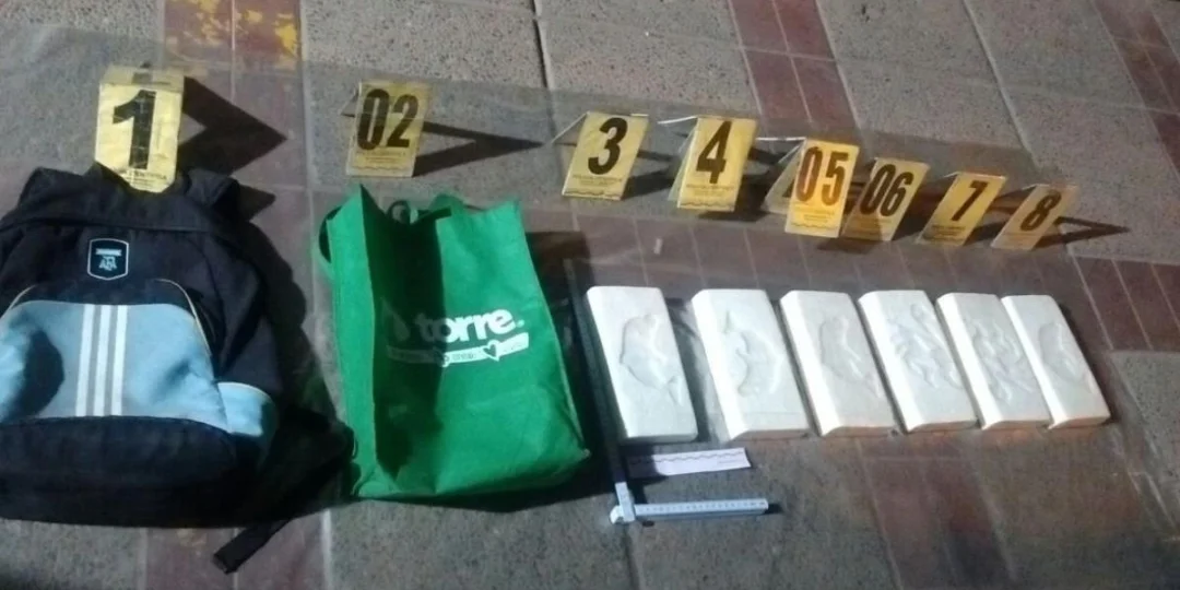 Una vez que estaban reducidos por las autoridades, se llevó a cabo una minuciosa inspección del rodado y allí se logró secuestrar del interior del mismo, un bolso con “6 ladrillos de sustancia blanquecina”.
