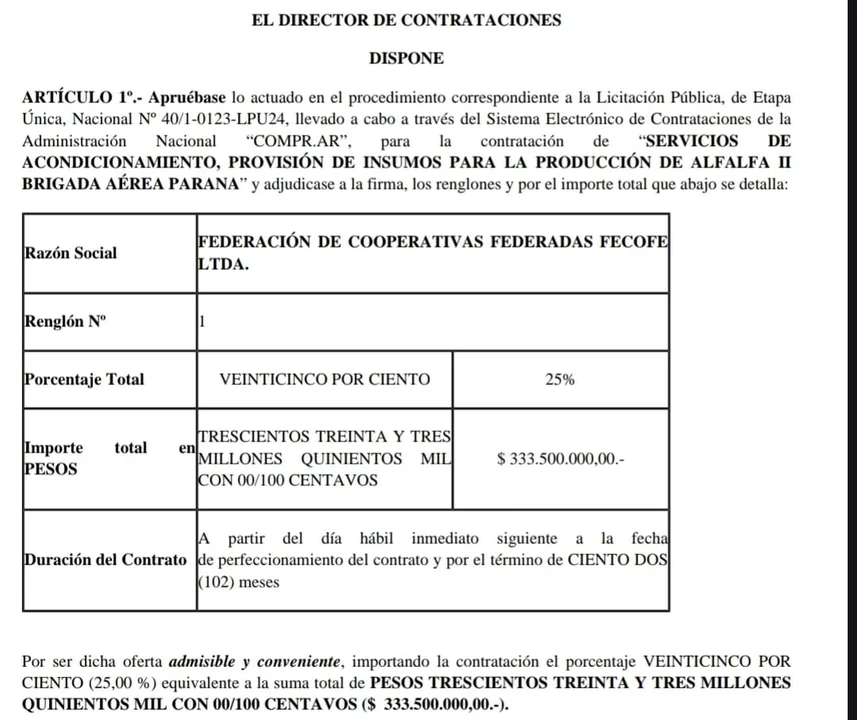 Otro caso bajo la lupa es la Licitación Pública N° 40/1-0123-LPU24, destinada al acondicionamiento de terrenos para la producción de alfalfa en la II Brigada Aérea Paraná. Este proyecto, adjudicado a la Federación de Cooperativas Federadas (FECOFE Ltda.) por $333.500.000, fue presentado como una iniciativa para mejorar la calidad del suelo.