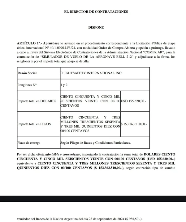 Entre los contratos que más polémica han generado está la Licitación Pública N° 40/1-0090-LPU24, destinada a adquirir un simulador de vuelo para la aeronave Bell 212. Este acuerdo, adjudicado a la empresa estadounidense FlightSafety International Inc., implicó un desembolso de US$ 155.620 -o $153.363.510 al tipo de cambio oficial-, una cifra que no pasó desapercibida en medio de la crisis económica del país.