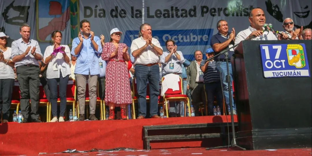 El multitudinario acto por el Día de la Lealtad que organizó el gobernador Juan Manzur en Tucumán dejó una postal con dos ex candidatos presidenciales arriba del escenario, como fueron Daniel Scioli y Sergio Massa, además de mandatarios provinciales y la cúpula de la CGT en pleno.