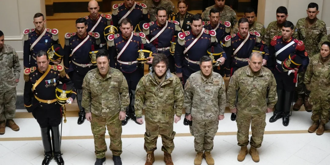 El mandatario nacional sorprendió al llegar vestido con indumentaria del Ejército y compartió la jornada junto al ministro de Defensa, Luis Petri, recientemente confirmado como candidato a diputado nacional por Mendoza, la diputada nacional de La Libertad Avanza (LLA), Lilia Lemoine, y a Macarena Jimena Rodríguez, señalada en redes como la "CM de Adorni", aunque desde el entorno oficial aclararon que se desempeña como fotógrafa del jefe de Estado.