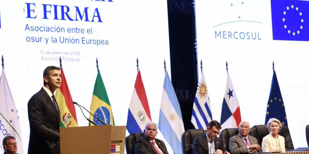 La formalización del acuerdo entre el Mercosur y la Unión Europea (UE) establece un mercado de 450 millones de consumidores. El documento prevé la eliminación de aranceles para el 92% de las exportaciones del bloque sudamericano. El Gobierno nacional proyecta que los envíos argentinos hacia Europa pasarán de 8.641 millones de dólares en 2025 a 19.165 millones de dólares en un plazo de diez años.