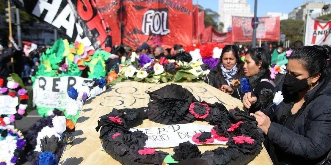 "El salario ha muerto: cortejo fúnebre. Los trabajadores de las organizaciones sociales, cooperativistas, precarizados, despedimos sus restos este viernes 19 de agosto desde las 12 en Plaza de Mayo", sostuvieron los organizadores de la convocatoria, que incluyó la presencia de un ataúd e incluso coronas de flores y la publicación de un aviso fúnebre.
