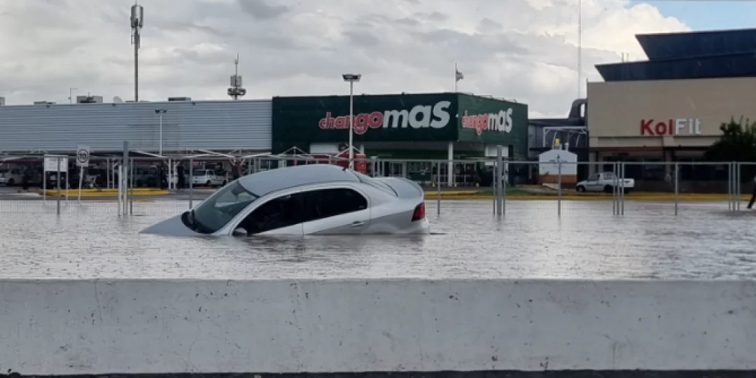 Un automóvil quedó hundido en el agua que se estancó rápidamente frente a un supermercado en la intersección de las calles Maza y Mitre. Foto Rodrigo Cuello