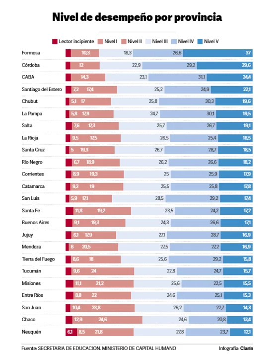 Desde 1995 gobernada por Gildo Insfrán, la provincia logró que el 63,6% de los alumnos alcanzara el nivel de logros esperados, con un sorprendente 36,6% ubicado en el nivel más alto de desempeño. A su vez, solo el 2,8% fue clasificado como "lector incipiente".