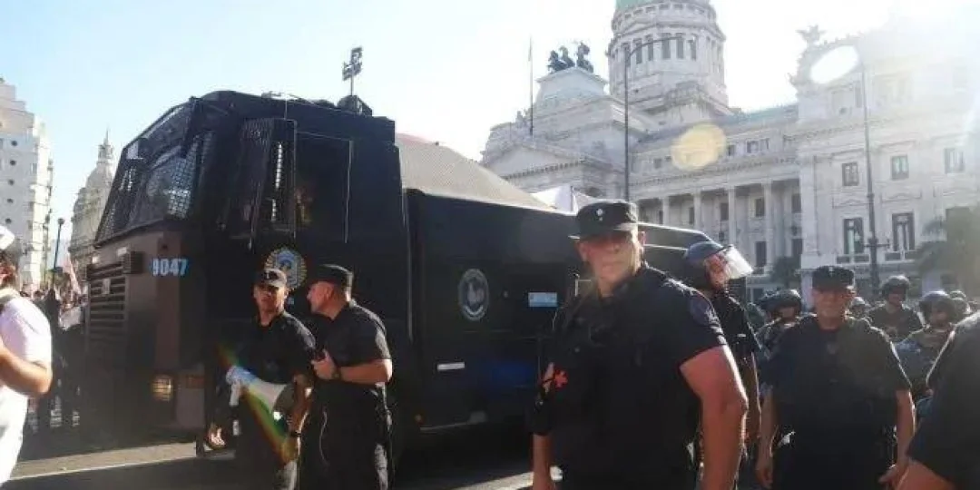 Tras una hora de incidentes en la Plaza Congreso, la Prefectura se sumó al operativo de la Gendarmería y la Policía Federal para hacer retroceder a los grupos y lograr que se mantuvieran sobre la vereda.