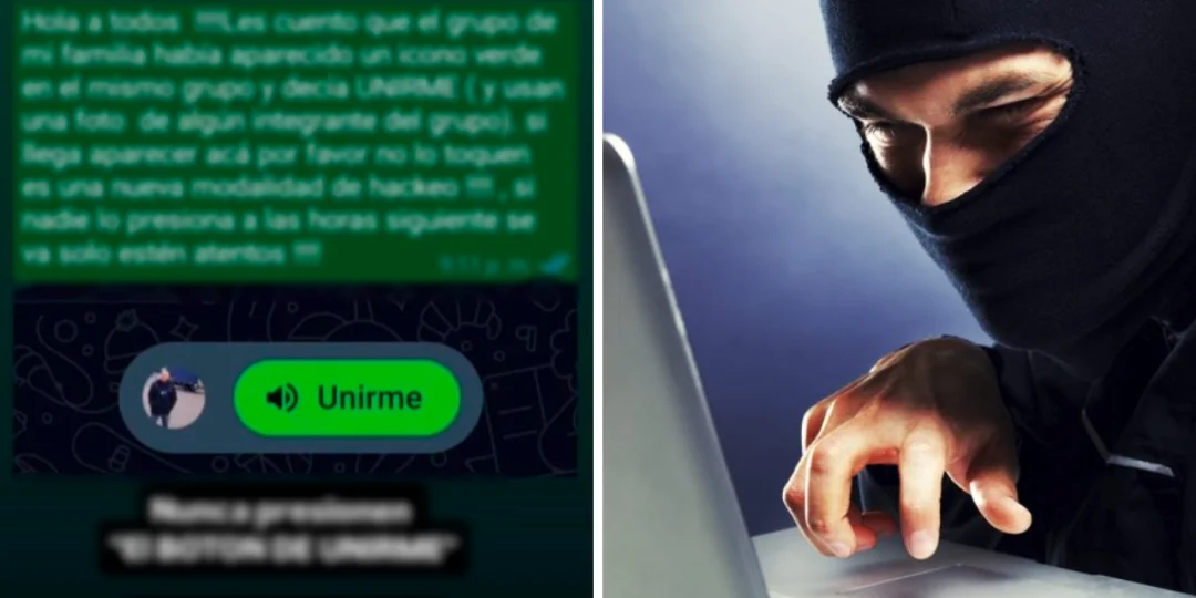 La estafa se presenta de manera sutil, pero peligrosa: en un chat con un número desconocido aparece un botón verde con la palabra "Unirme", acompañado por la foto de perfil de un integrante real de nuestros contactos y presumiblemente de alguno de los grupos que tenemos.