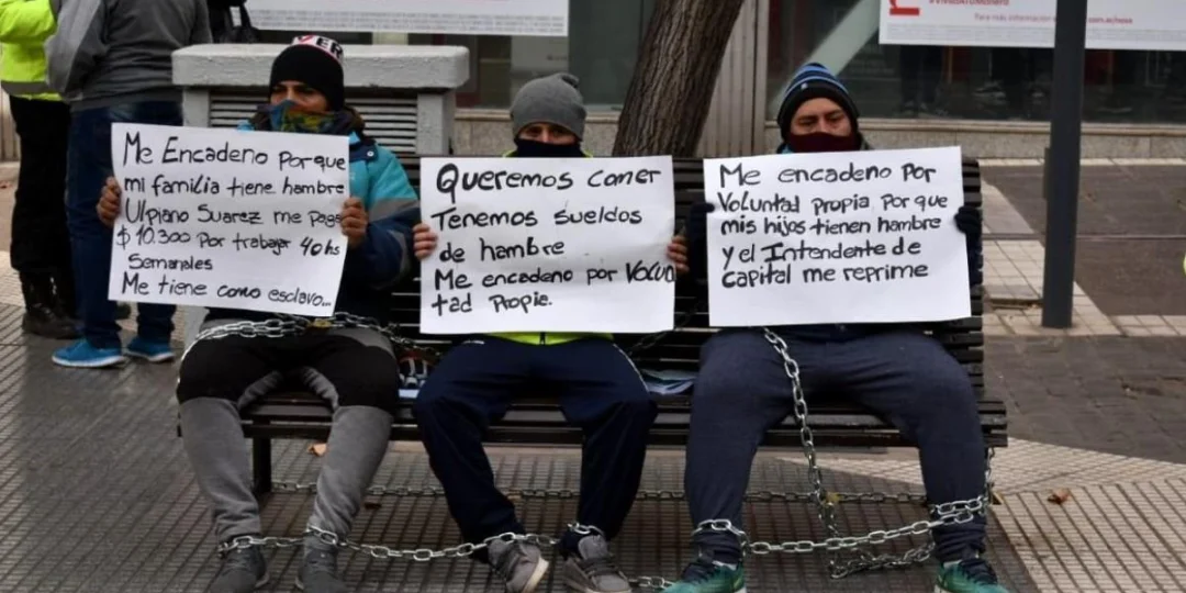 Esta vez, un grupo de empleados se encadenó en bancos de la Peatonal Sarmiento exigiendo al intendente Ulpiano Suarez un aumento de sueldo, argumentando que actualmente cobran un básico de $10.000 por mes y con jornadas laborales de ocho horas, cifra que está por debajo del salario mínimo, vital y móvil.