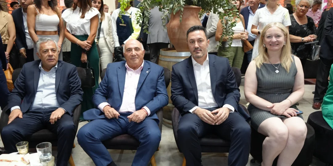 Los anfitriones del Desayuno Real, Emilio Luis Magnaghi, presidente de la Cooperativa, Empresa Eléctrica de Godoy Cruz, licenciada Claudia Magnaghi, vicepresidente de la empresa y Jorge Magnaghi, concejal de Godoy Cruz, recibieron en el Espacio Arizu vestido de gala, al gobernador de Mendoza, Alfredo Cornejo, junto a la vicegobernadora, Hebe Casado, en el marco de los festejos vendimiales.