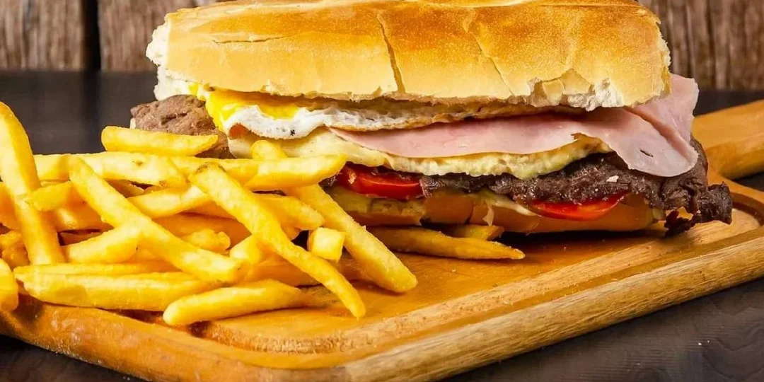 "Es una versión extrema del sándwich de carne: relleno con lomo en rodajas finas, tomates, cebollas, lechuga, mayonesa, salsa chimichurri, jamón, queso y un huevo frito".