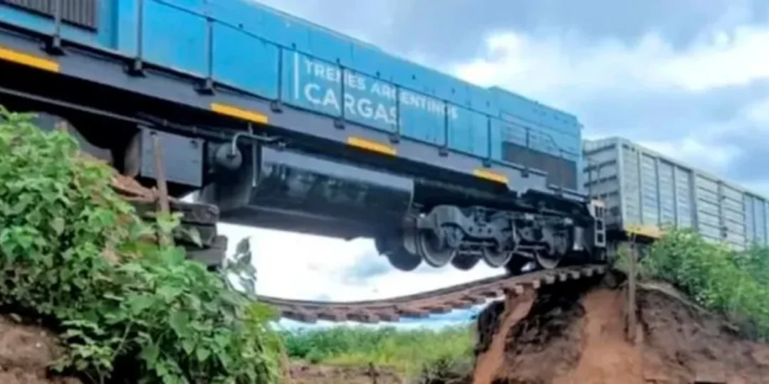 La formación, de la empresa Trenes Argentinos Cargas, quedó colgando tras el colapso, aunque sostenida por el resto de los vagones, lo que evitó la caída al vacío.