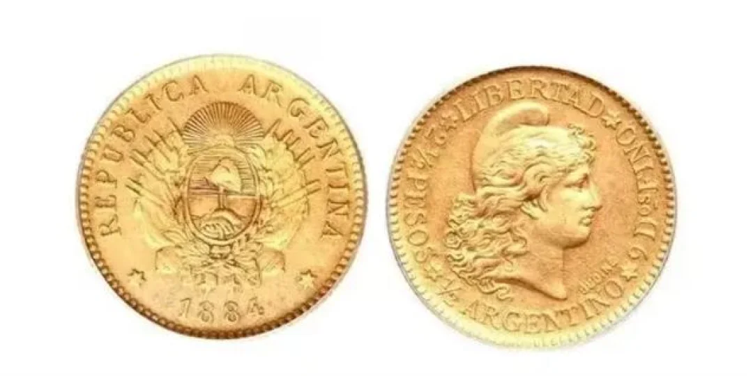 En este caso en particular es de oro, se llama el "Medio Argentino", y se vende en hasta 70 mil dólares en sitios de subastas especializadas en Estados Unidos. Son ejemplares del año 1881, cuando se establecieron estrictas normativas sobre la acuñación de monedas de oro en Argentina, y eso llevó a que se produjeran apenas nueve ejemplares de 2,5 pesos, que fueron presentados como modelo ante las autoridades de la época.